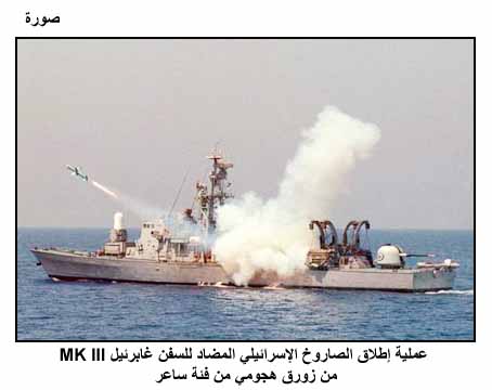 عملية إطلاق الصاروخ الإسرائيلي المضاد للسفن غابرئيل MK III، من زورق هجومي من فئة ساعر