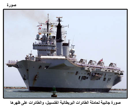 صورة جانبية لحاملة الطائرات البريطانية انفنسيبل، والطائرات على ظهرها