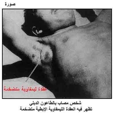 شخص مصاب بالطاعون الدبلي تظهر فيه العقدة الليمفاوية الإبطية متضخمة