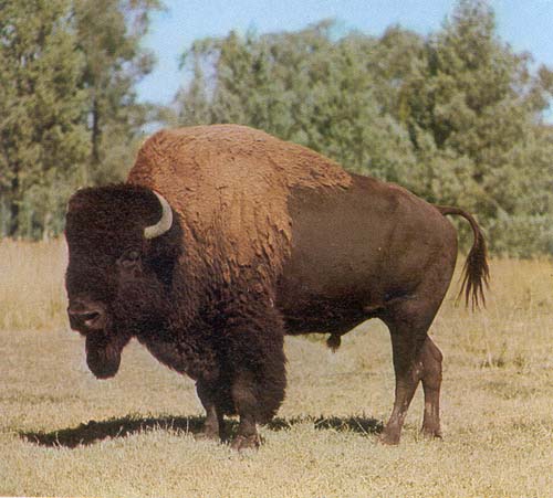 الجاموس (الثور) البسون الأمريكي، يكاد ينقرض. يعيش في البراري الأمريكية