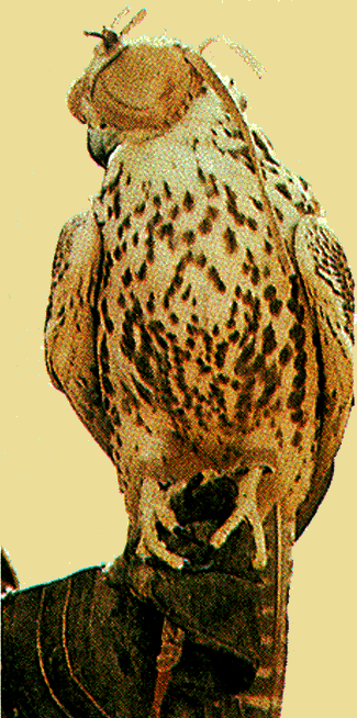 صقر يقف على يد صقَّار، وعيناه مغطيتان بالبرقع