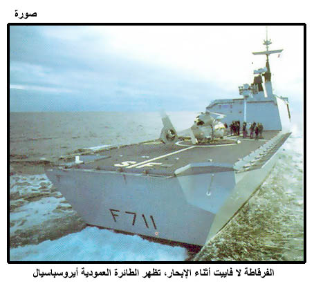 الفرقاطة لا فاييت أثناء الإبحار، تظهر الطائرة العمودية أيروسباسيال