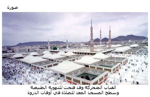 القباب المتحركة وقد فتحت للتهوية الطبيعية،وسطح المسجد المعد للصلاة في أوقات الذروة