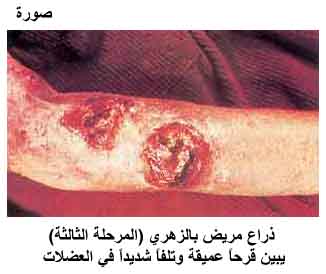 ذراع مريض بالزهري (المرحلة الثالثة) يبين قرحاً عميقاً وتلفاً شديداً في العضلات