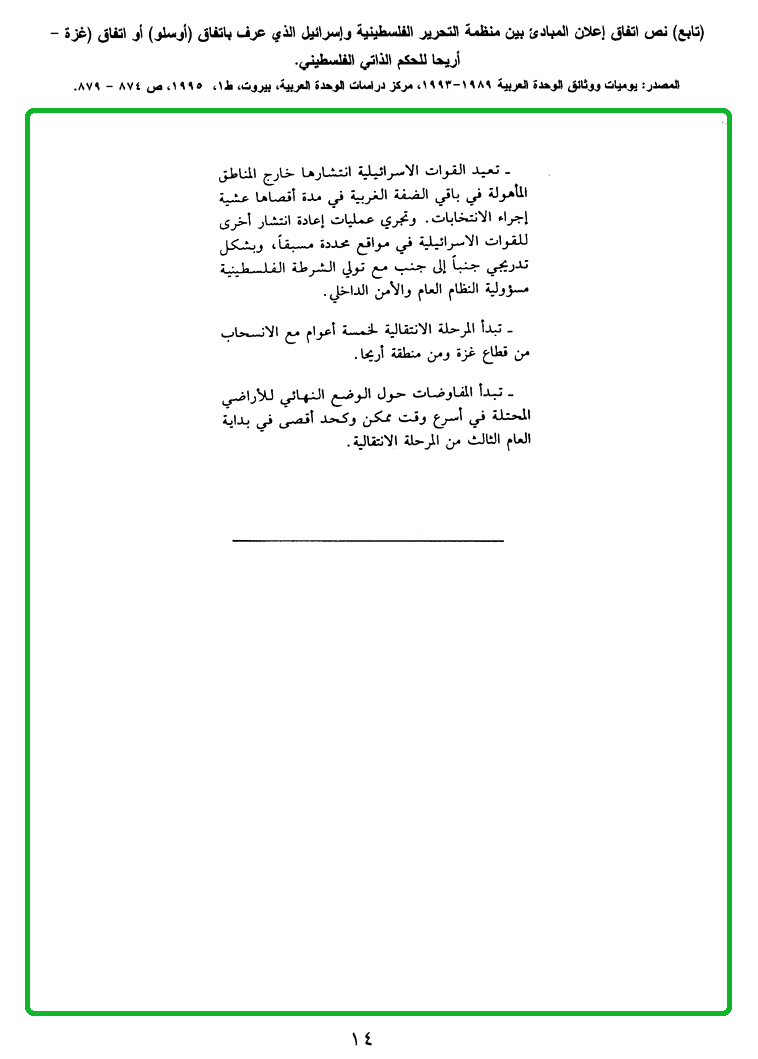 (تابع) نص اتفاق إعلان المبادئ بين منظمة التحرير الفلسطينية وإسرائيل الذي عرف باتفاق "أسلو" أو اتفاق "غزة ـ أريحا للحكم الذاتي الفلسطيني