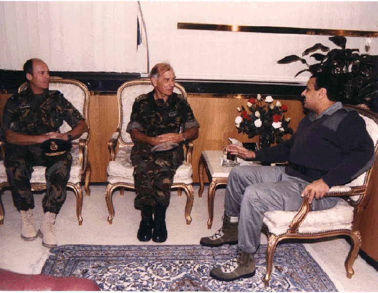 صاحب السمو الملكي الفريق الركن خالد بن سلطان بن عبدالعزيز، قائد القوات المشتركة ومسرح العمليات، والجنرال السير بيتر دي لابليير، قائد القوات البريطانية، في مكتب سموه