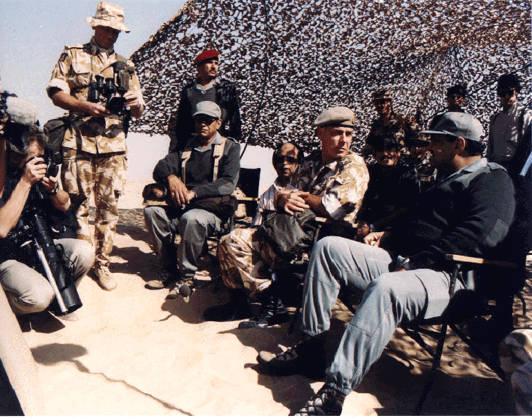 الفريق الركن خالد بن سلطان والجنرال السير بيتر دي لابليير، يشهدان إحدى المناورات العسكرية، خلال الاستعدادات لحرب تحرير دولة الكويت