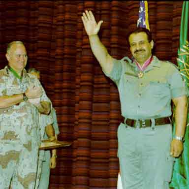 في احتفال بسيط، ولكنه مؤثر، قلّدني الفريق أول شوارتزكوف "وسام الاستحقاق من درجة قائد"، كما سلّمني خطاباً شخصياً من الرئيس بوش، بينما قلّدته "وسام الملك عبد العزيز من الطبقة الأولى"، وكانت تلك هي المرة الأولى التي يُقَدّم فيها هذا الوسام الرفيع إلى ضابط غير سعودي.