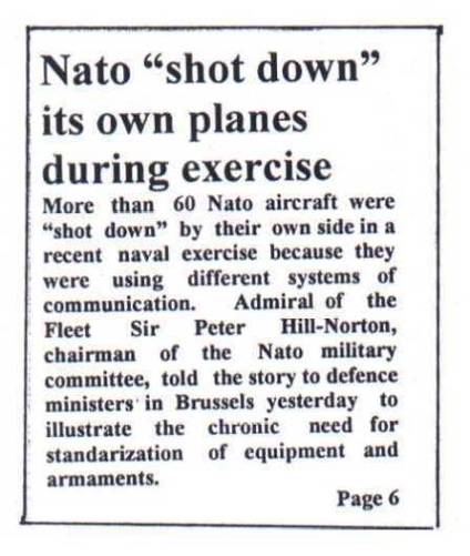 وهنا تجدر الإشارة إلى تقرير قديم عن مناورات حلف شمال الأطلسي، التي أجريت في نوفمبر 1974. وفيه أعلن الأدميرال بيتر هيل نورتون Peter Hill - Norton، رئيس اللجنة العسكرية للحلف، آنذاك، أمام اجتماع عُقد في بروكسل Brussels، وضم وزراء دفاع دول الحلف، أن وسائل الدفاع الجوي لقوات الحلف، أسقطت ما يربو على 60 طائرة صديقة.