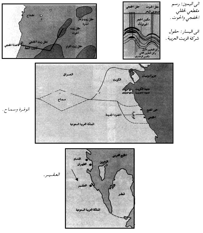 إلى اليمين: رسم مقطعي لحقلي الخفجي والحوت - إلى اليسار: حقول شركة الزيت العربية
