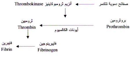 ثم يقوم إنزيم الثرومبوكاينيز بمساعدة أيونات الكالسيوم، بتحويل مادة بروتينية منحلة في بلازما الدم تسمى بروثرومبين Prothrombin، وهي مادة غير نشطة، إلى مادة ثرومبين Thrombin النشطة. ويؤثر الثرومبين على بروتين آخر في بلازما الدم يسمى فايبرينوجين (Fibrinogen)، فيحوله إلى بروتين الفايبرين Fibrin، الذي تتكتل جزيئاته، لتنتج شبكة من الألياف تحاصر خلايا الدم الحمراء، الأمر الذي يؤدي إلى تكون الجلطة الدموية، وتوقف النزيف (أُنظر شكل خطوات تكوين الجلطة).