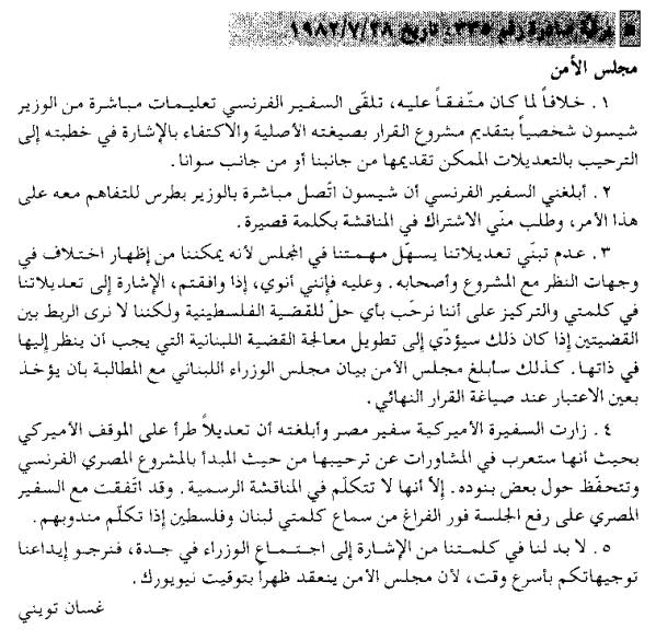 الصادرة من السفير اللبناني، غسان تويني، إلى وزير الخارجية اللبنانية