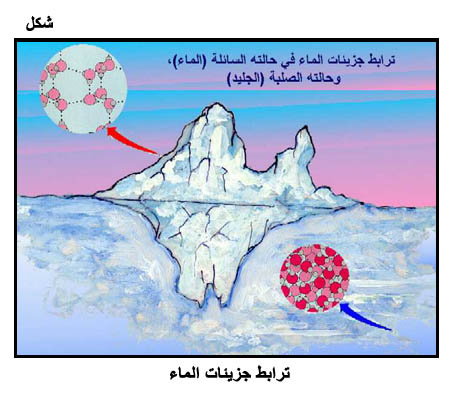 ترابط جزيئات الماء في حالته السائلة (الماء) وحالته الصلبة (الجليد)